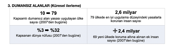Güçlü uygulama ve denetimin, tütün kontrolü yasalarına uyumun sağlanmasında kritik rol oynadığı vurgulanıyor. Kapsamlı dumansız alan yasası uygulayan ülke sayısı 2007’de 10 iken bugün 79’a ulaşmış durumda. Bu ülkelerde en iyi uygulama düzeyindeki yasalarla korunan insan sayısı ise 2,6 milyara ulaşıyor.